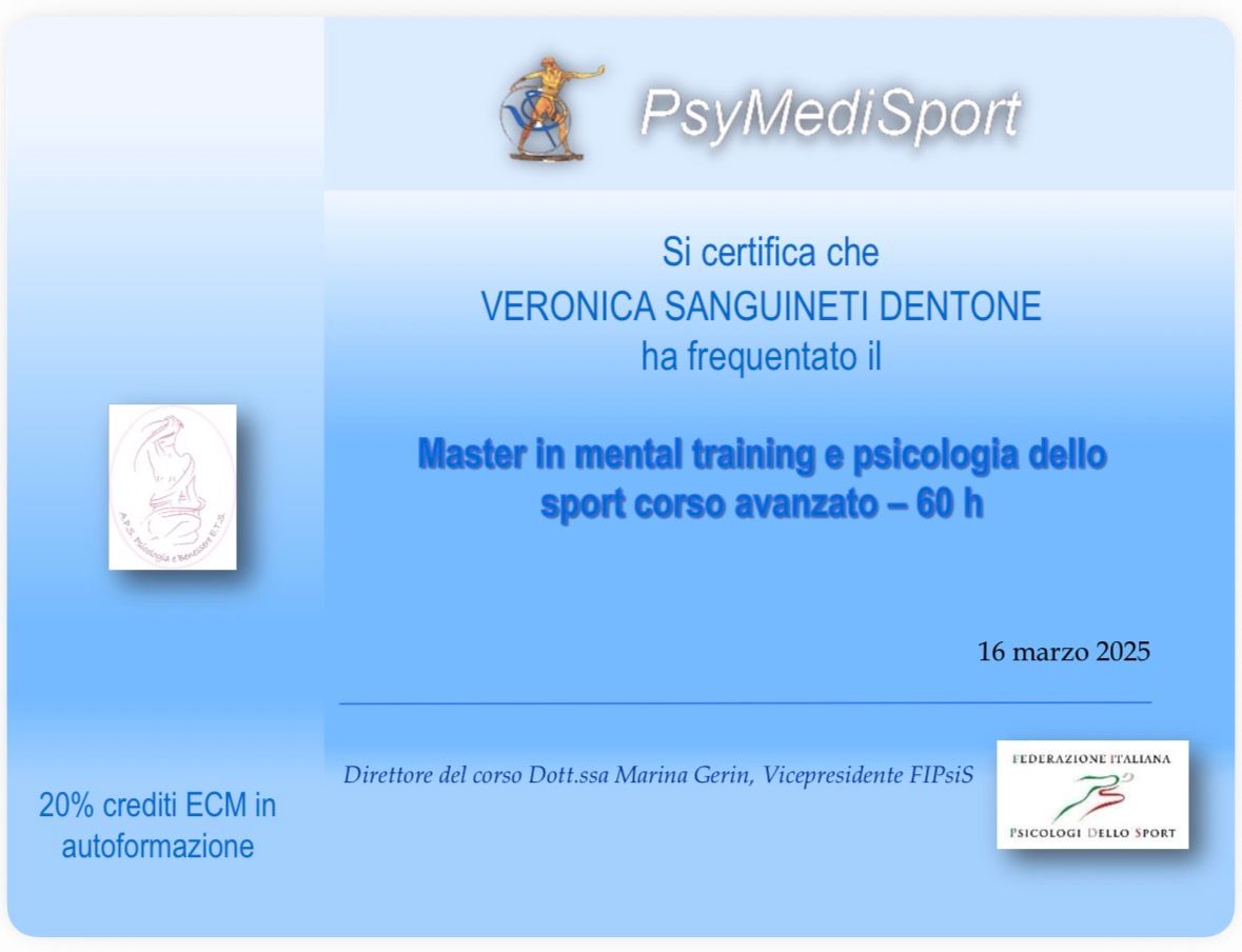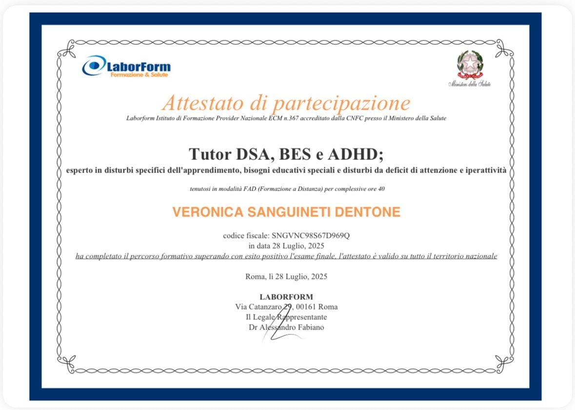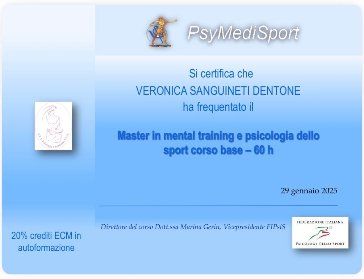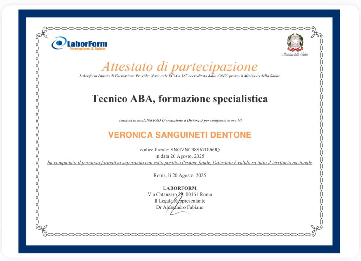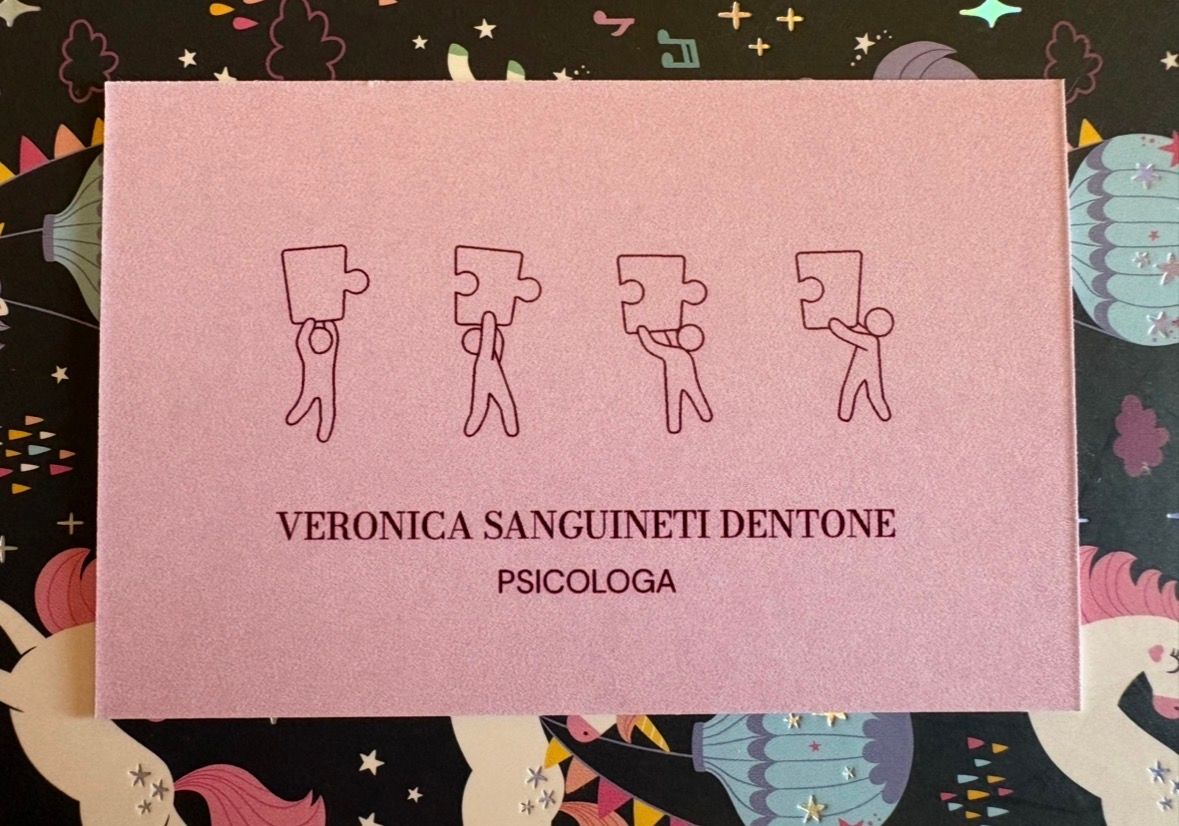 Sono Veronica Sanguineti Dentone, psicologa iscritta all'albo dell'Ordine degli Psicologi della Liguria con numero 3860. Mi sono laureata in Psicologia Clinica e di Comunità presso l'Università di Genova nel 2023 e ad oggi sono iscritta alla scuola di specializzazione in psicoterapia cognitivo comportamentale.